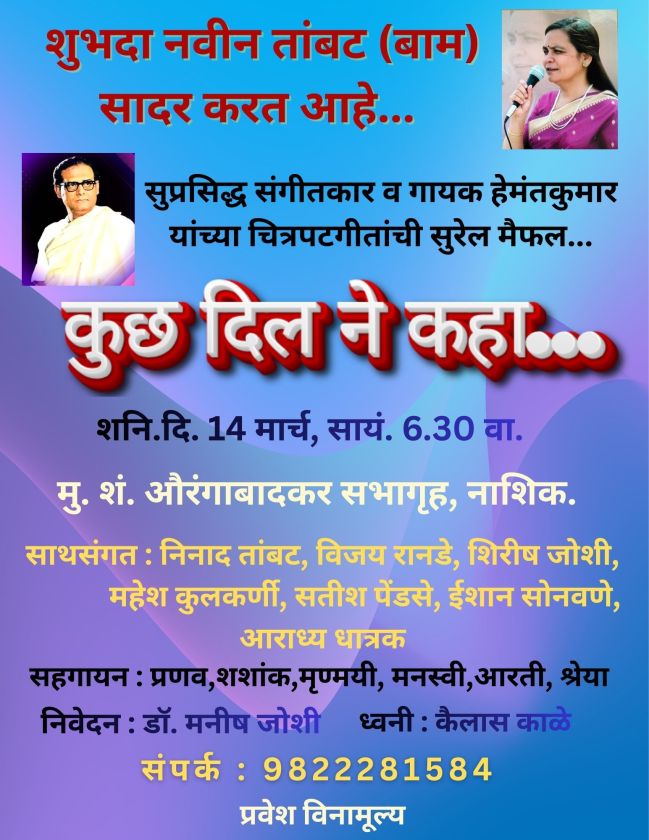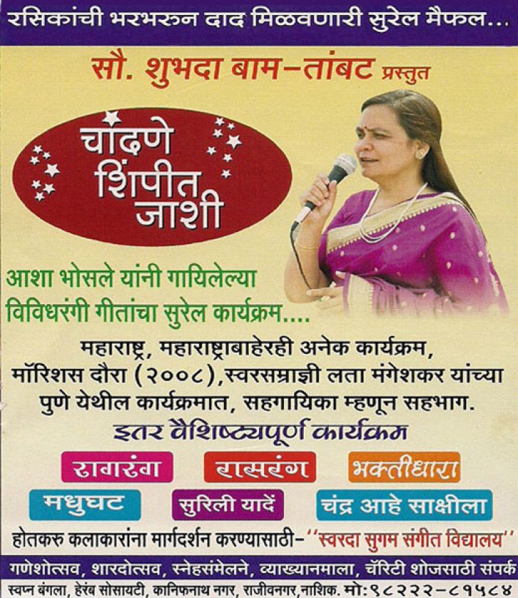 A programme based on Asha Bhosale's Marathi Evergreen Songs presented by Mrs Shubhada Bam Tambat